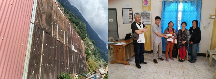 (Left) Roof condition of Manaba Church in dire need of repairs. (Right) Turn over of Php 50,000 check for the purchase of materials needed for the church’s repairs.